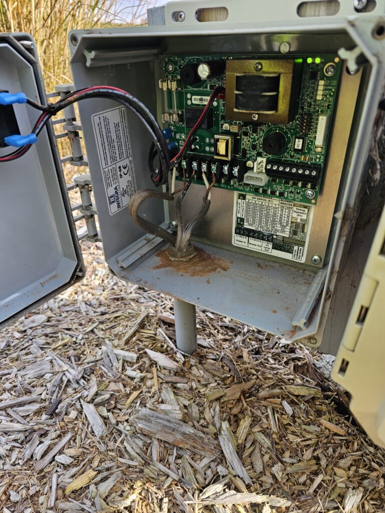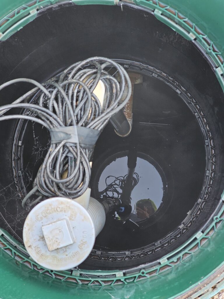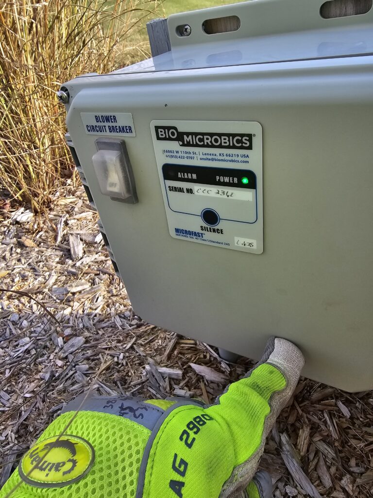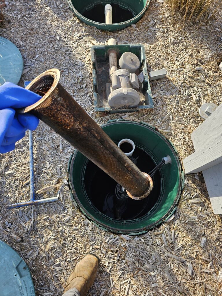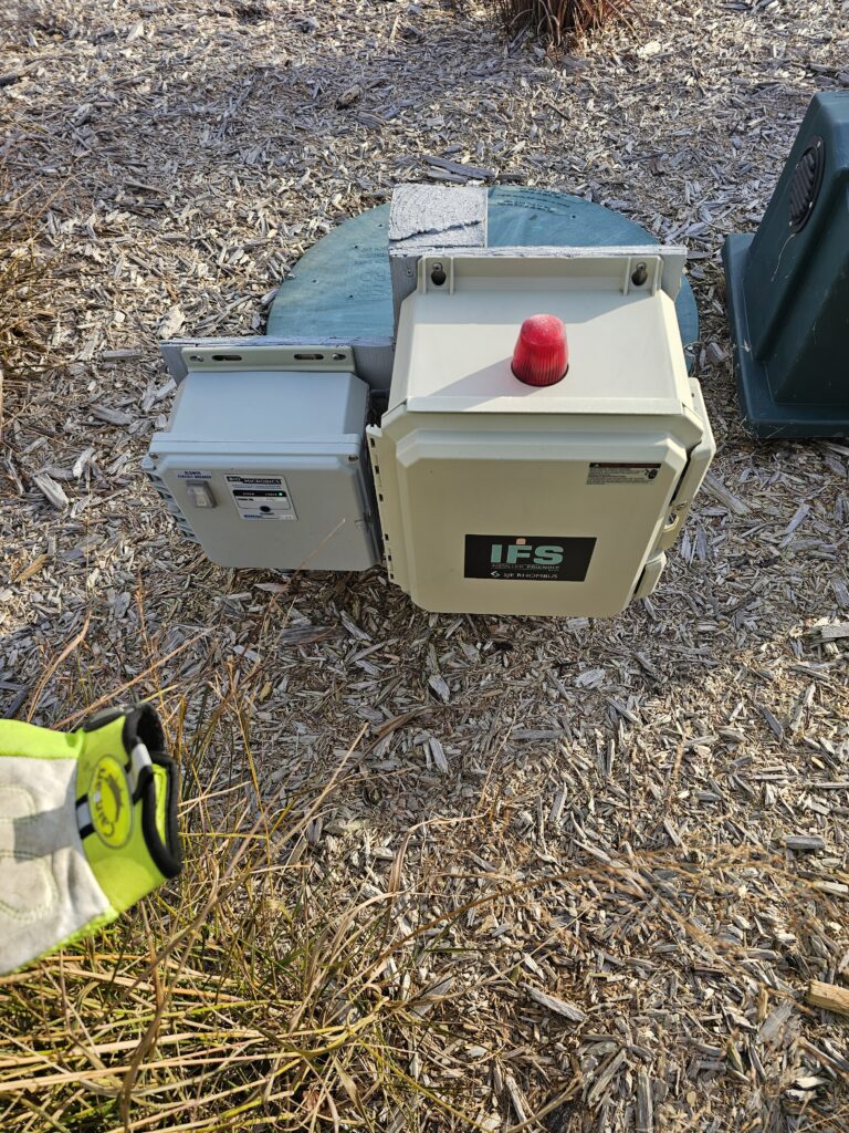 During the inspection, we measure sludge and scum levels and check for cracks, leaks, or structural damage in the tanks and their components. The inlet and outlet baffles are inspected to ensure they are intact and functioning properly, reducing the risk of blockages or wear. The pump filter is cleaned during every visit to ensure reliable operation and prevent clogs. A visual inspection of the mound system confirms that effluent is being properly distributed, and observation ports are checked for flow and saturation levels. A quick look at the control panels confirms proper float operation and pump control. We also assess the drain field.